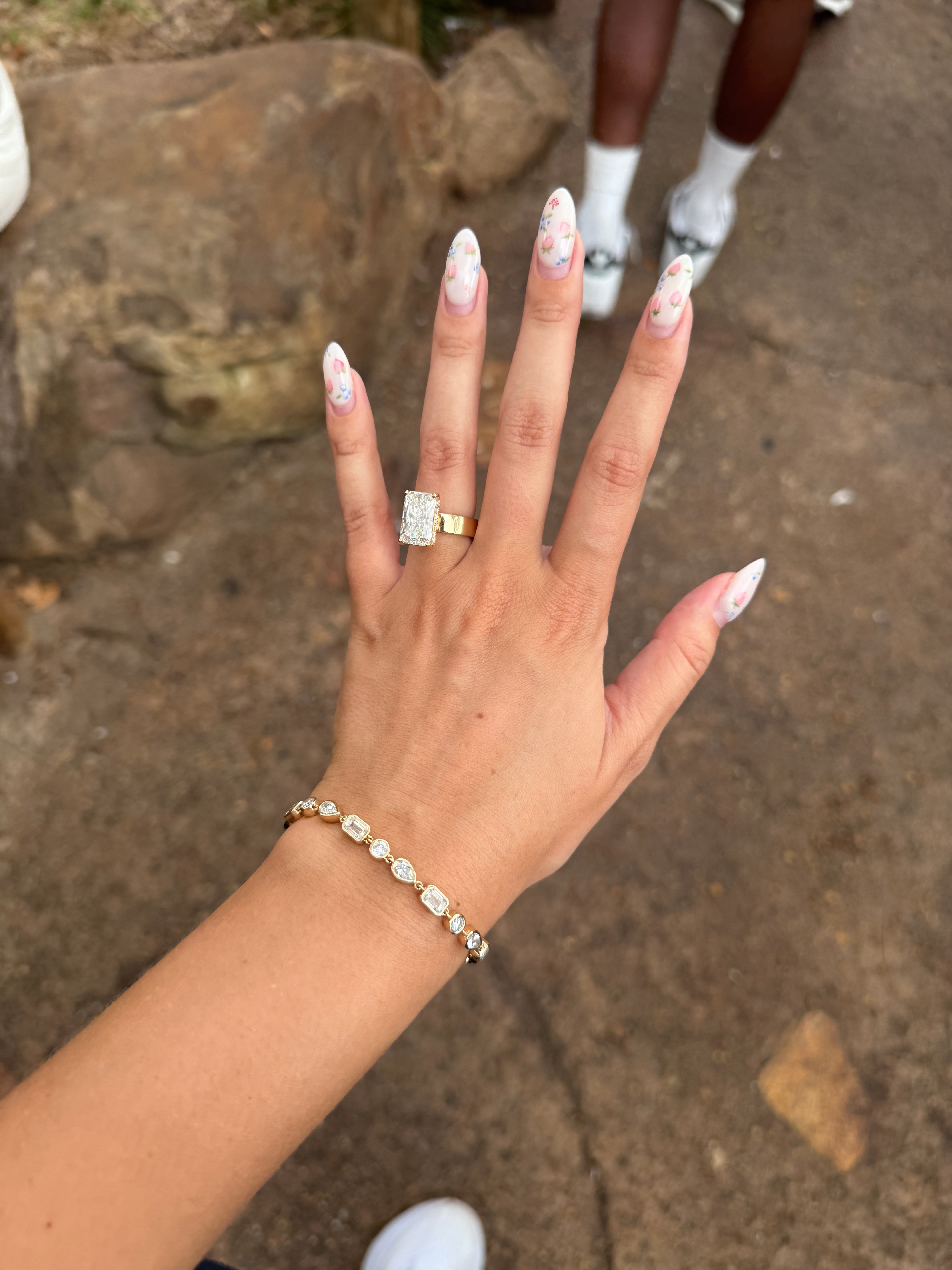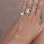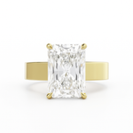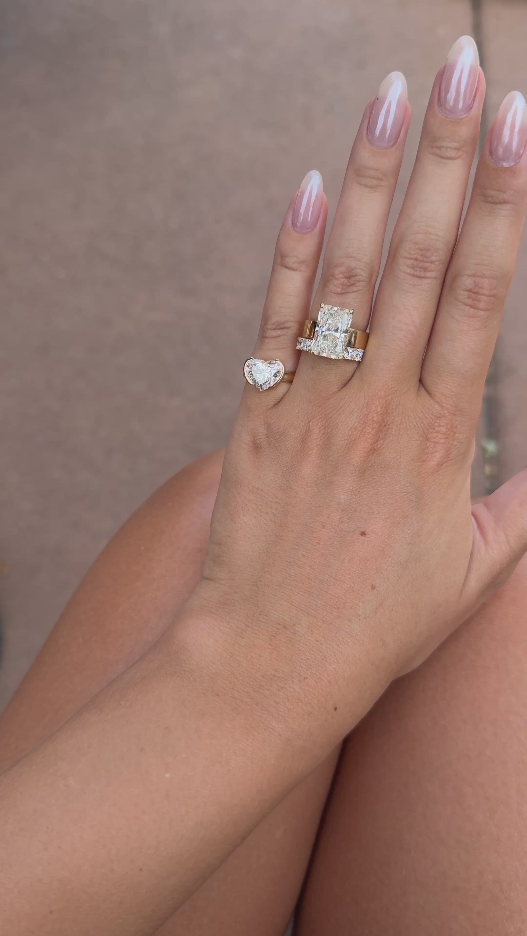 This ring makes a statement without even trying. The 5mm bold cigar band gives it that effortless, cool-girl look, while also being sturdy enough to hold any size diamond. A hidden halo underneath the center stone adds a touch of sparkle that complements the bold band in the most beautiful way. Shown here with a 4.5ct radiant lab-grown diamond, it’s the perfect mix of bold and timeless.
