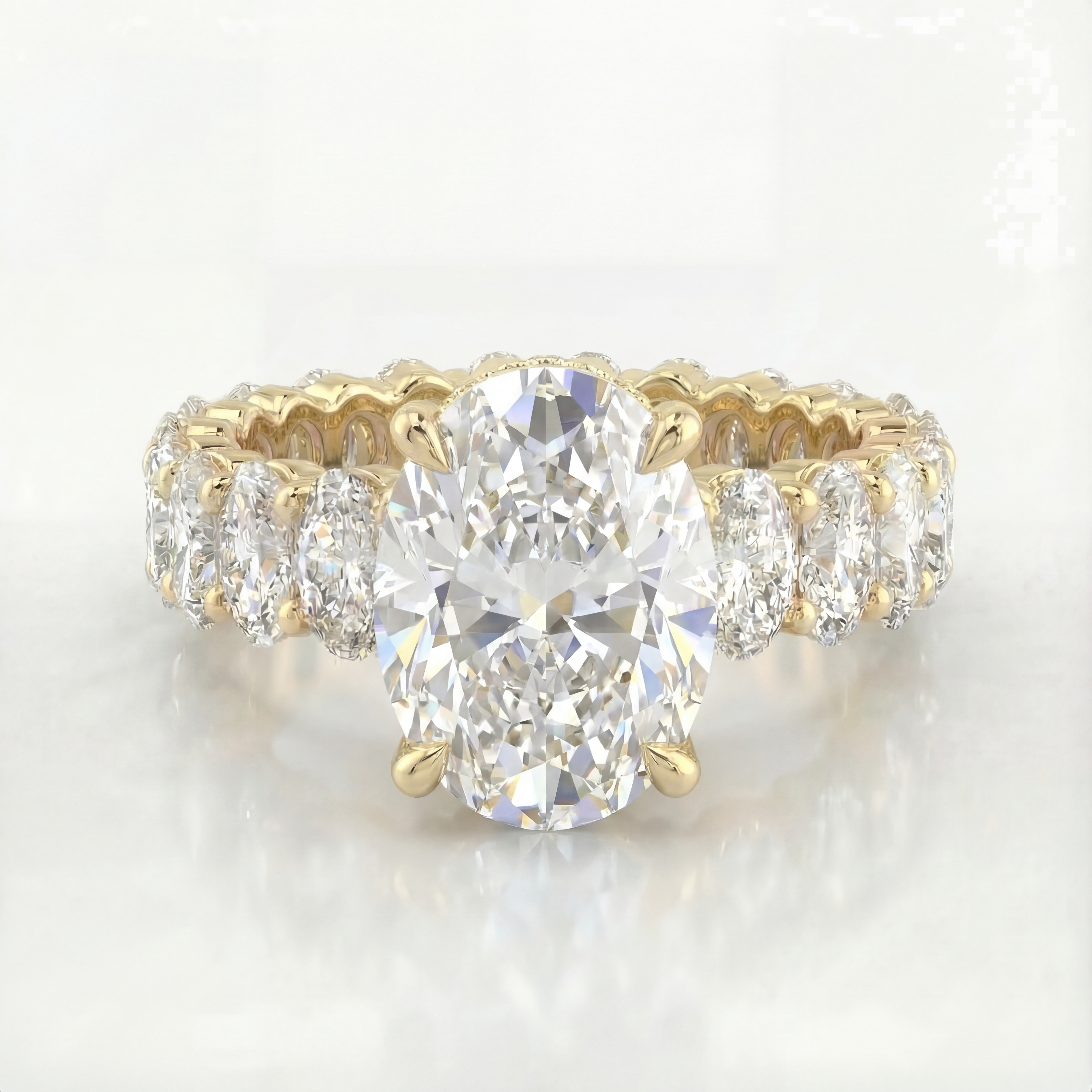 Bold, breathtaking, and designed to turn heads, The Estelle features a stunning radiant-cut center stone, set atop a 4.5mm oval eternity band for unmatched brilliance. Available in 3/4 eternity, with an optional hidden halo, the band allows for resizing and shimmers with dazzling diamonds from every angle, making this ring the ultimate statement of luxury.