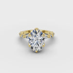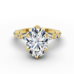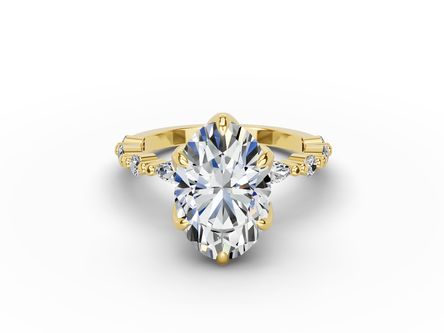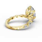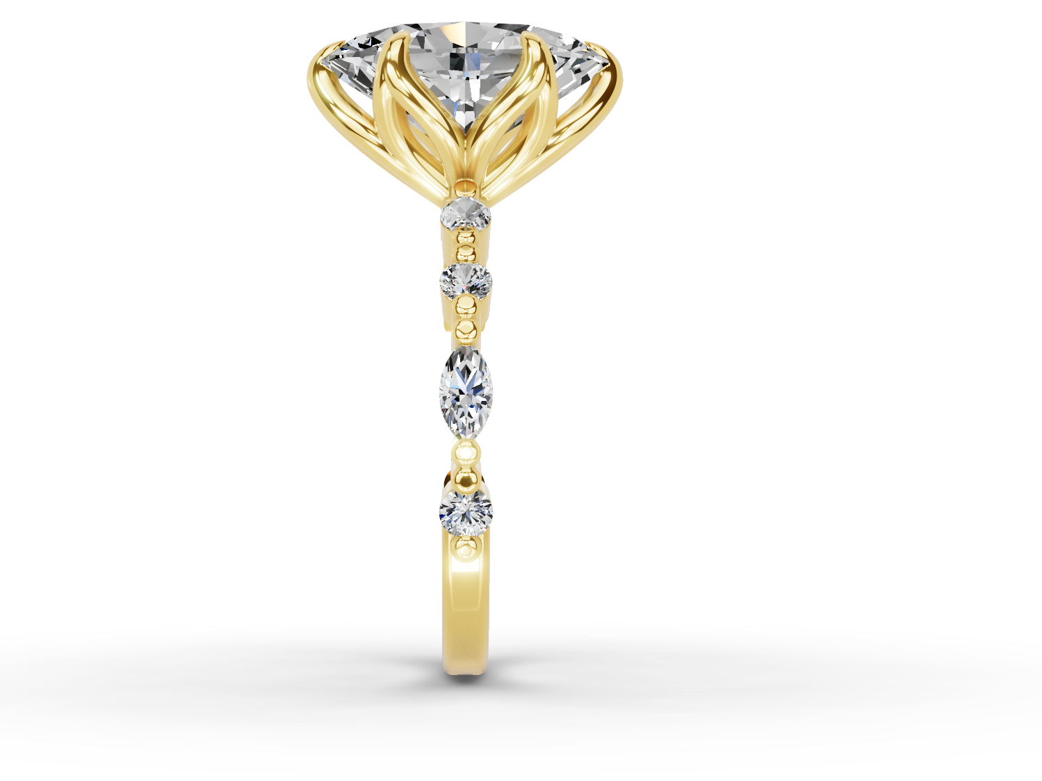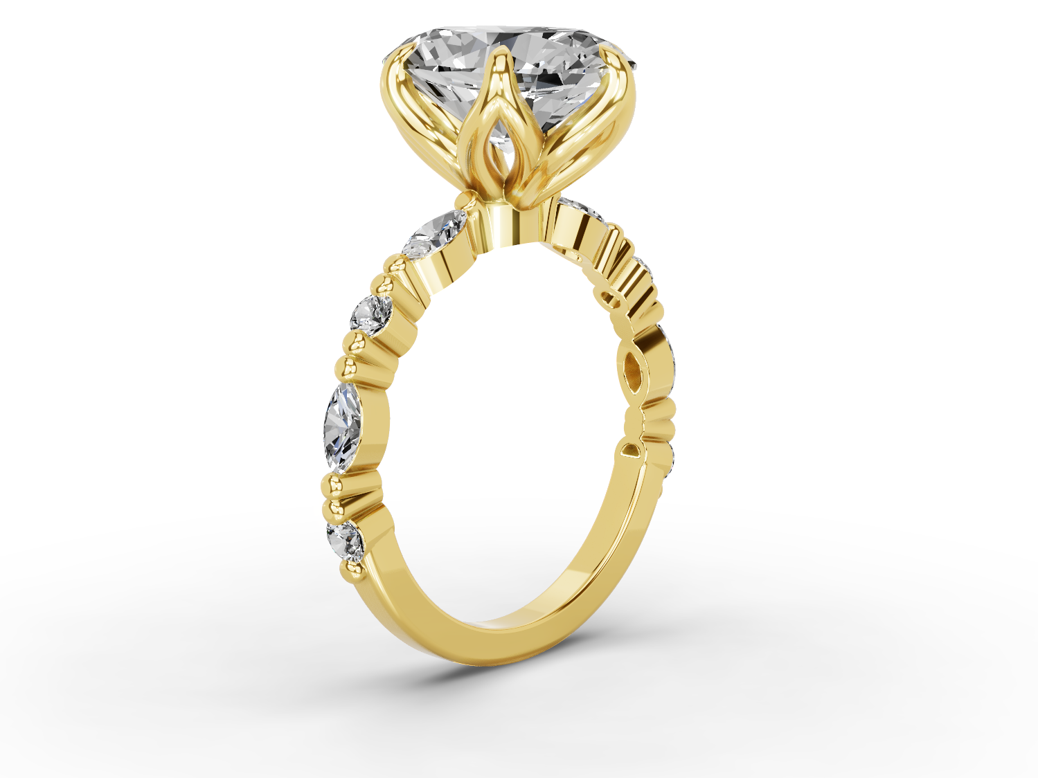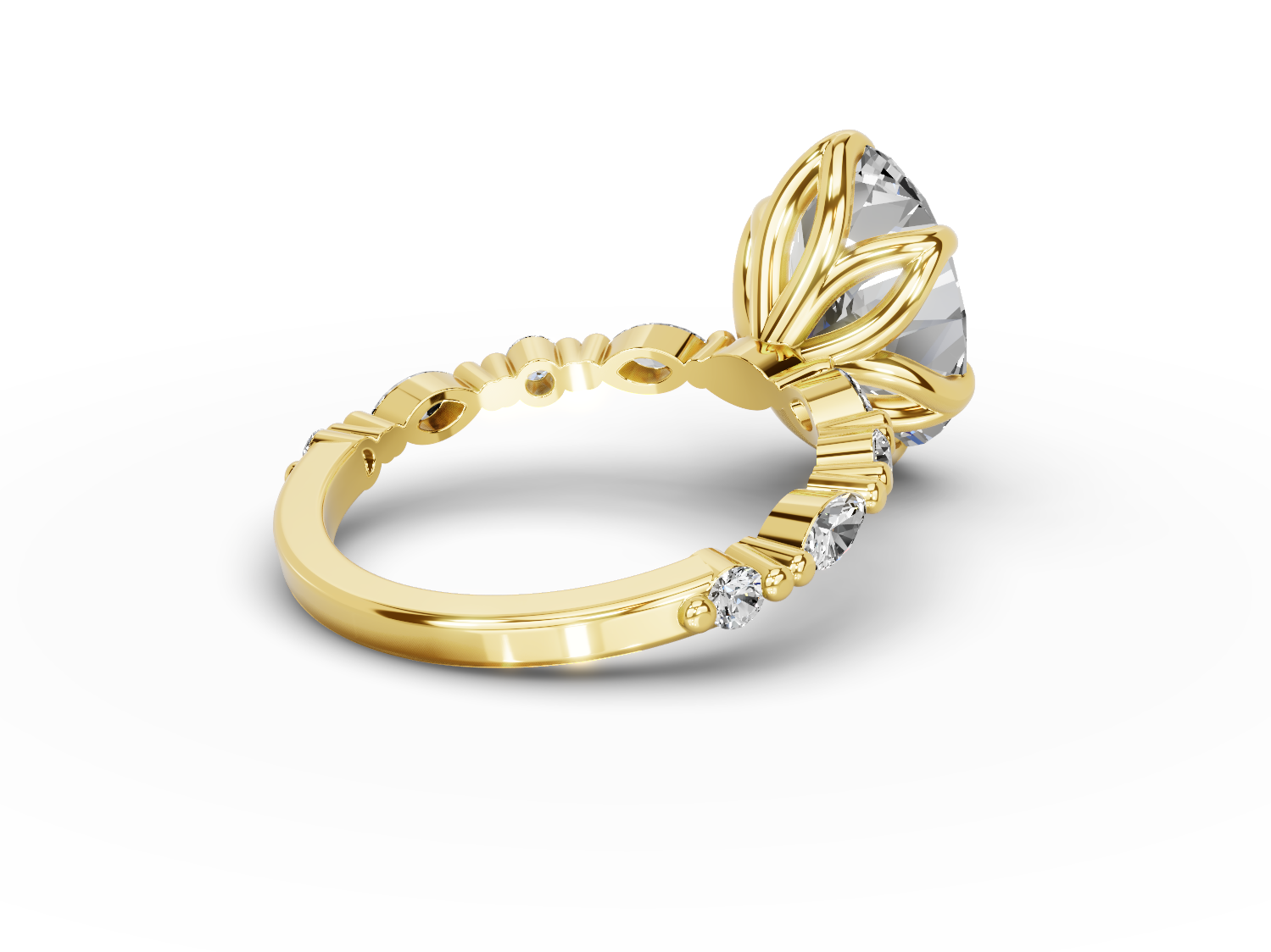 Graceful and romantic, The Odette captures the beauty of nature in a breathtaking design. A luminous marquise center stone is cradled by delicate petal-inspired prongs, evoking the elegance of a blooming flower. The band, adorned with marquise and round diamonds, mimics the organic flow of floral vines, creating a soft, feminine silhouette.