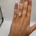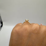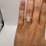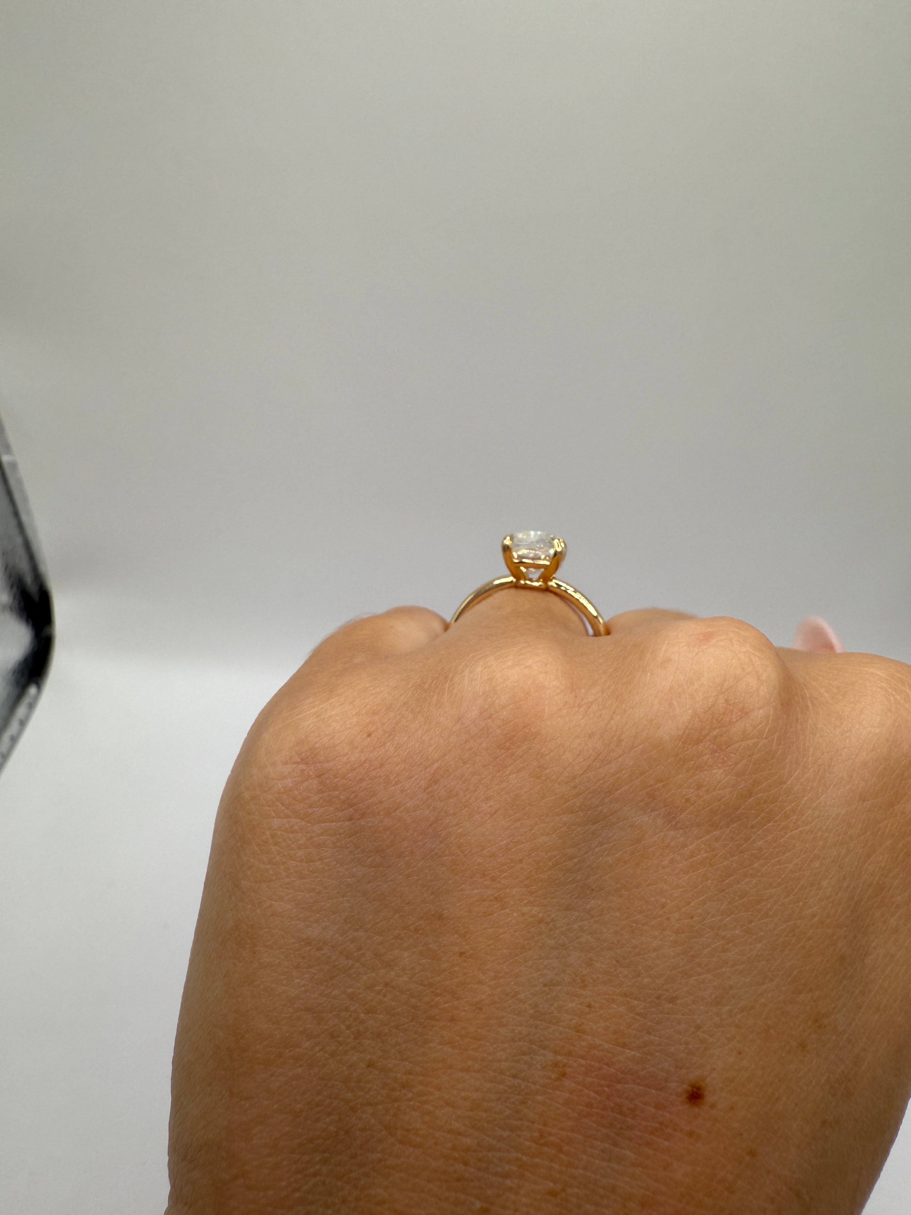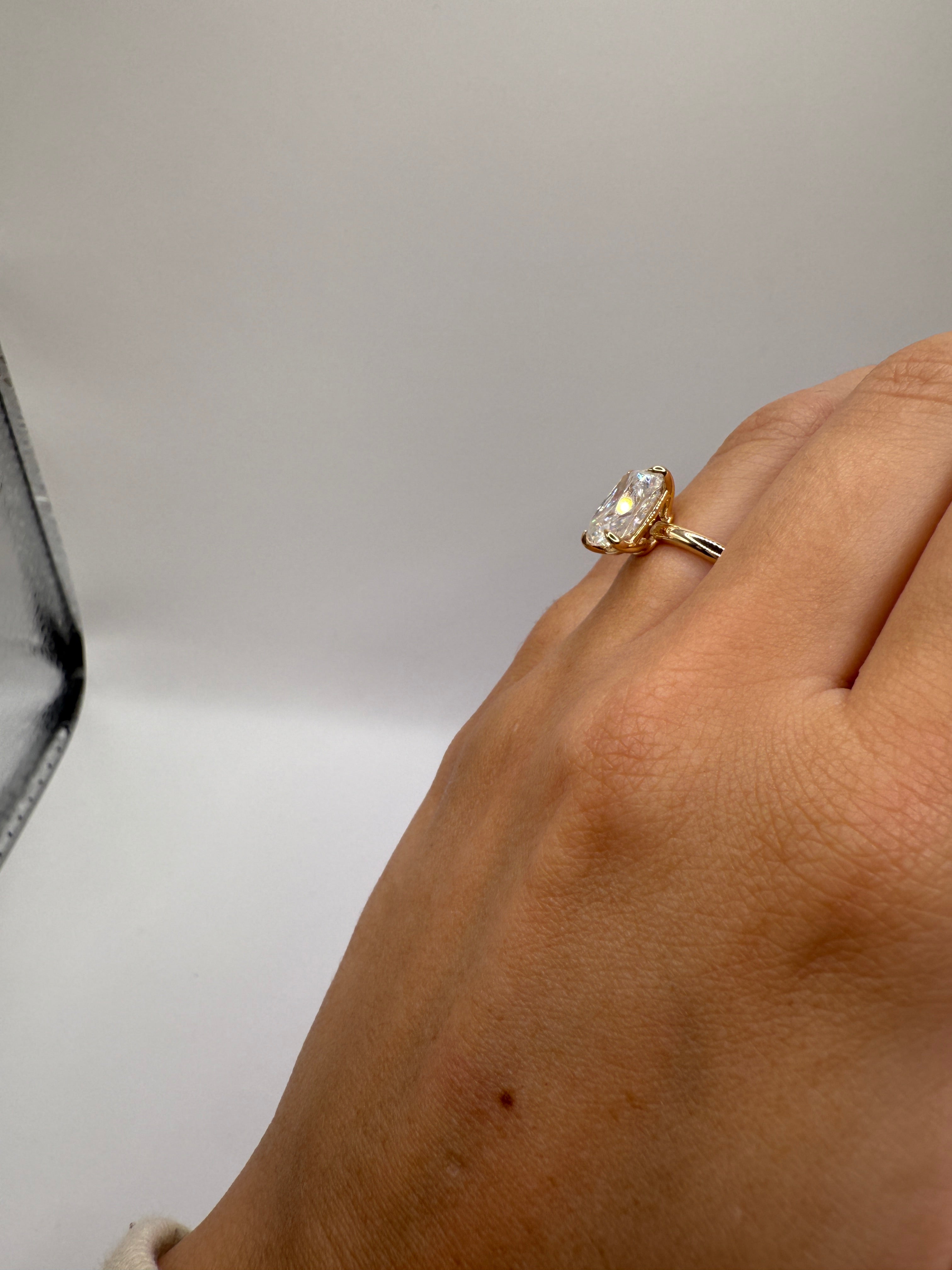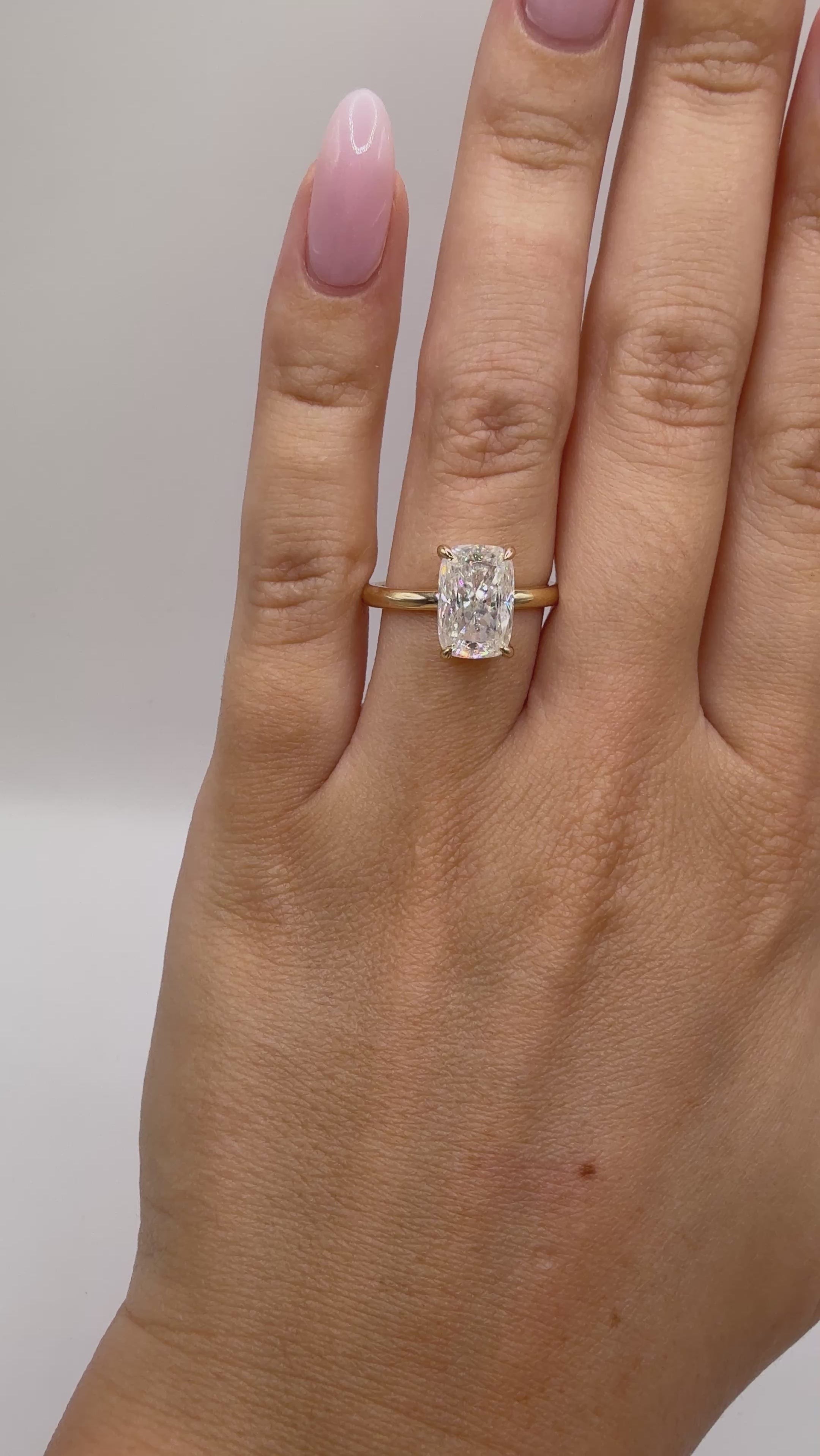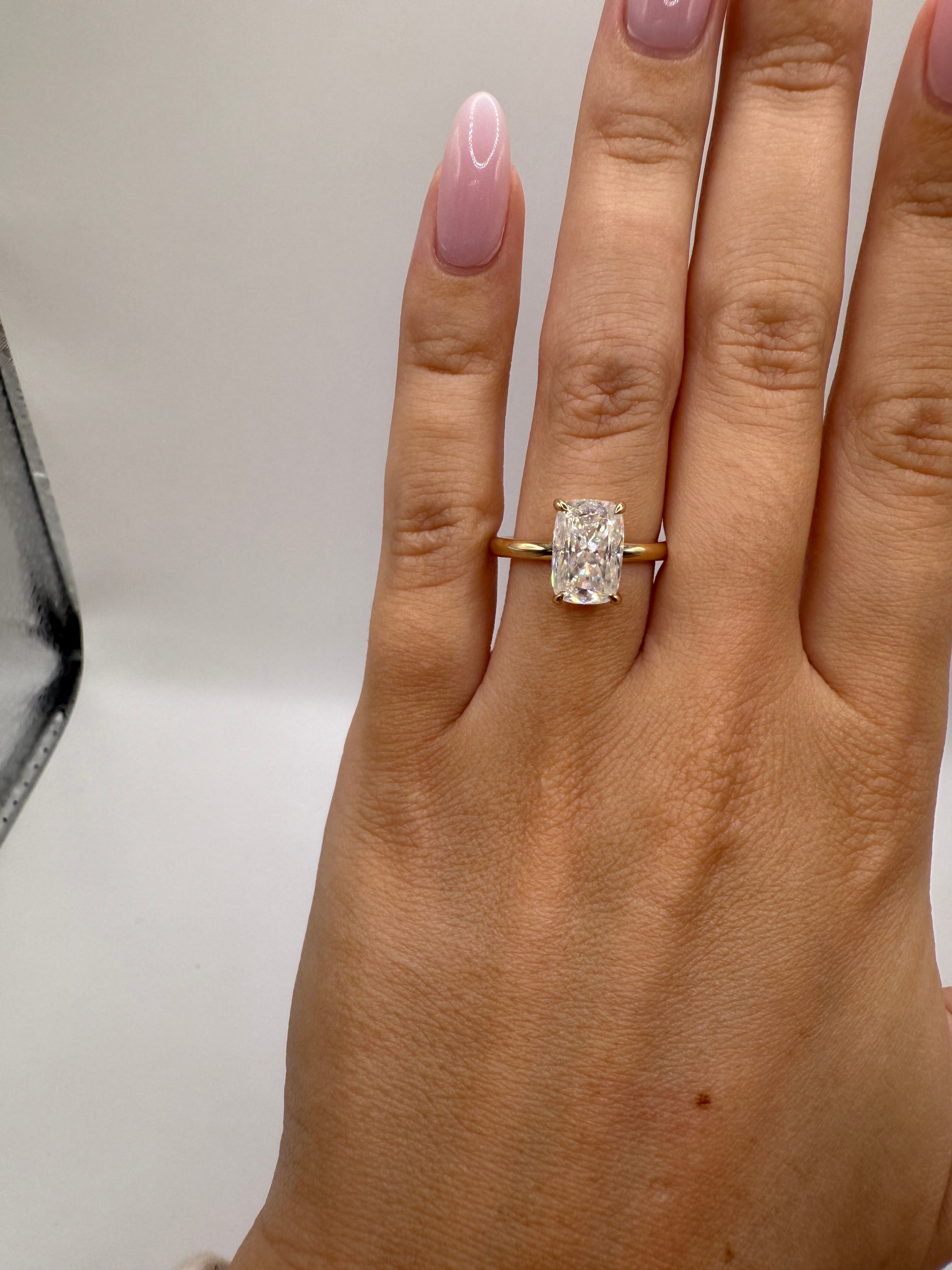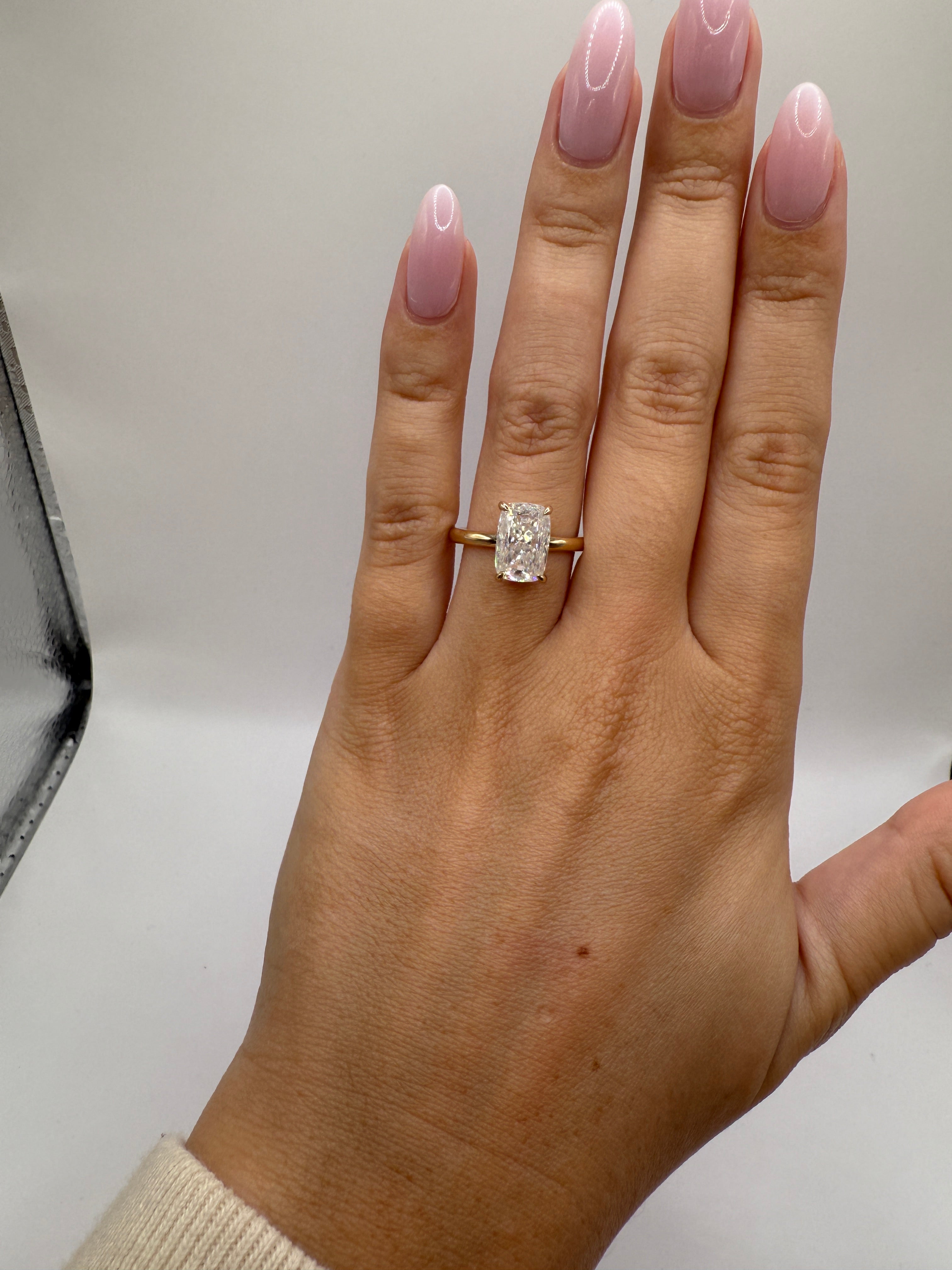This gorgeous solitaire features a 3ct elongated cushion moissanite, a low donut setting in 18k yellow gold and plain claw prongs, size 6. It's perfect!