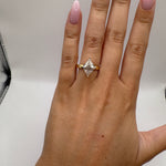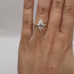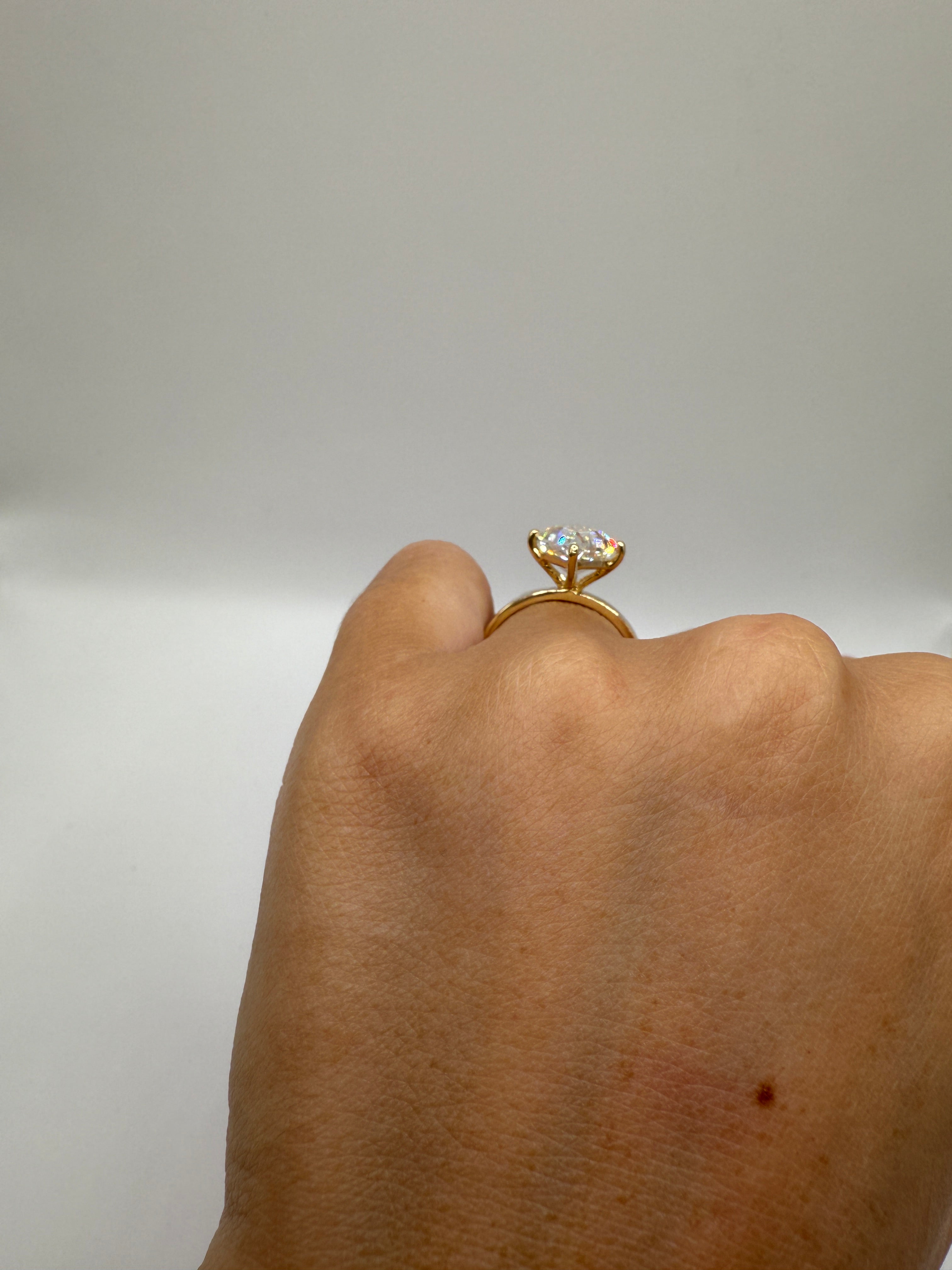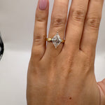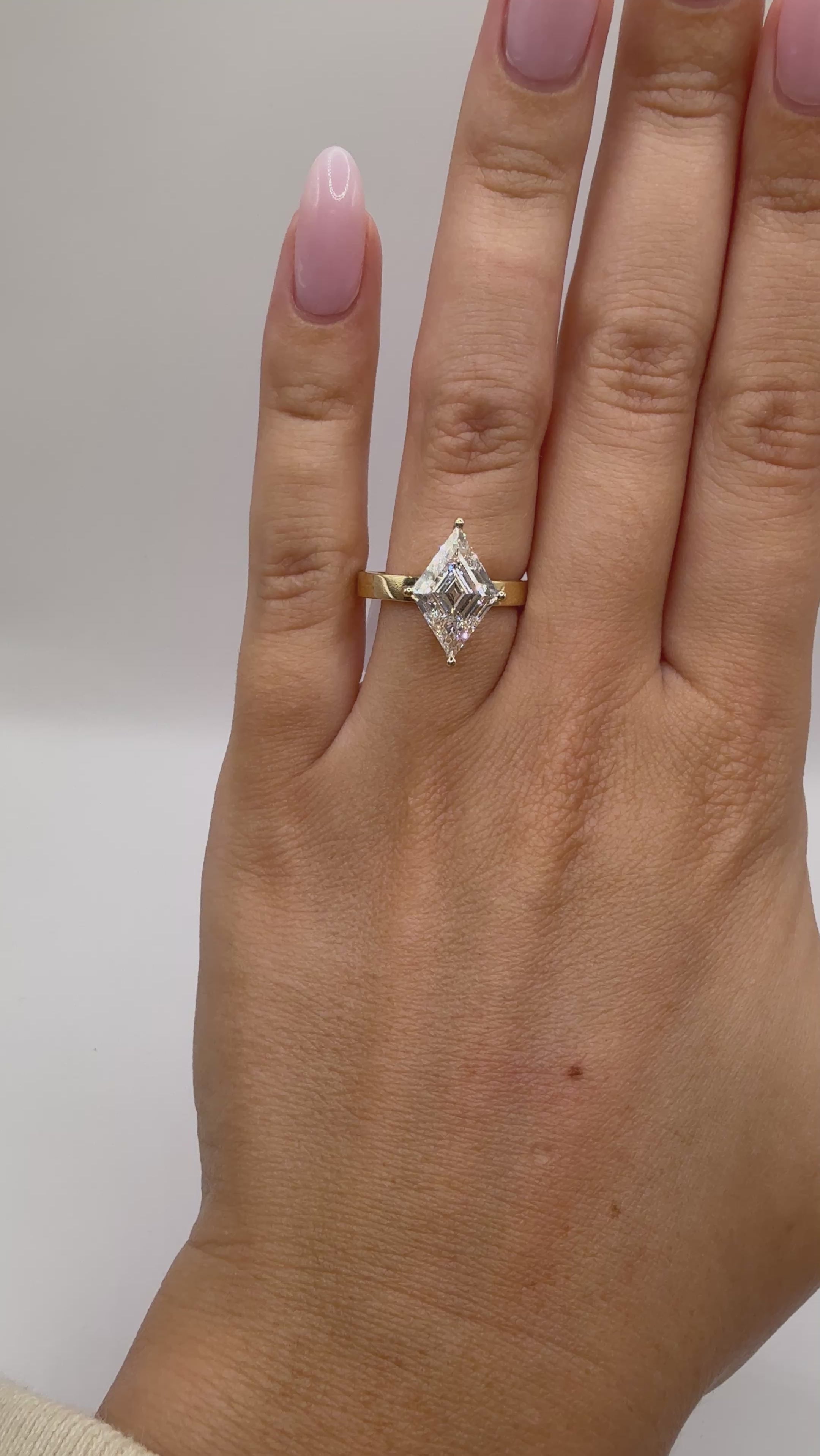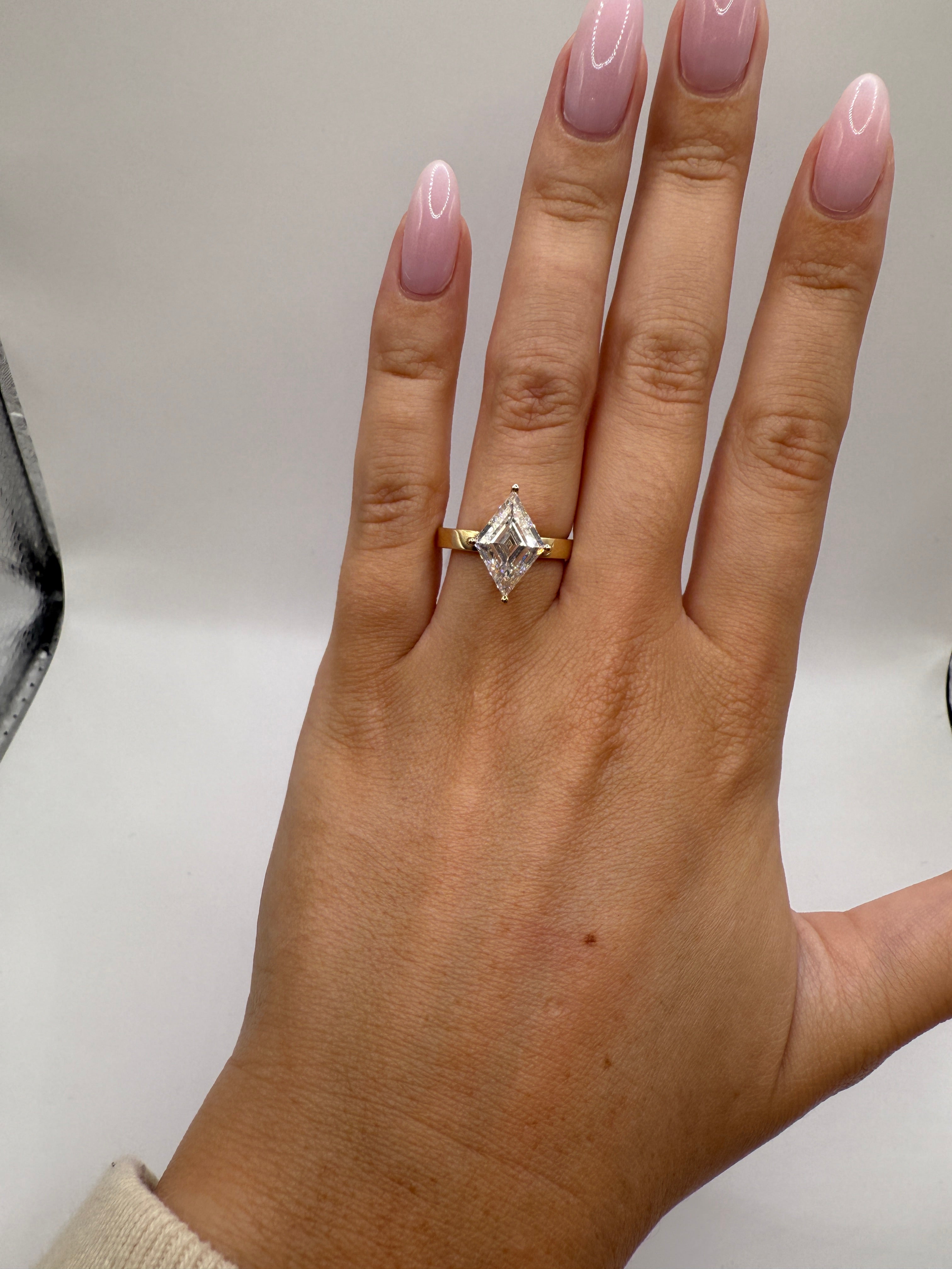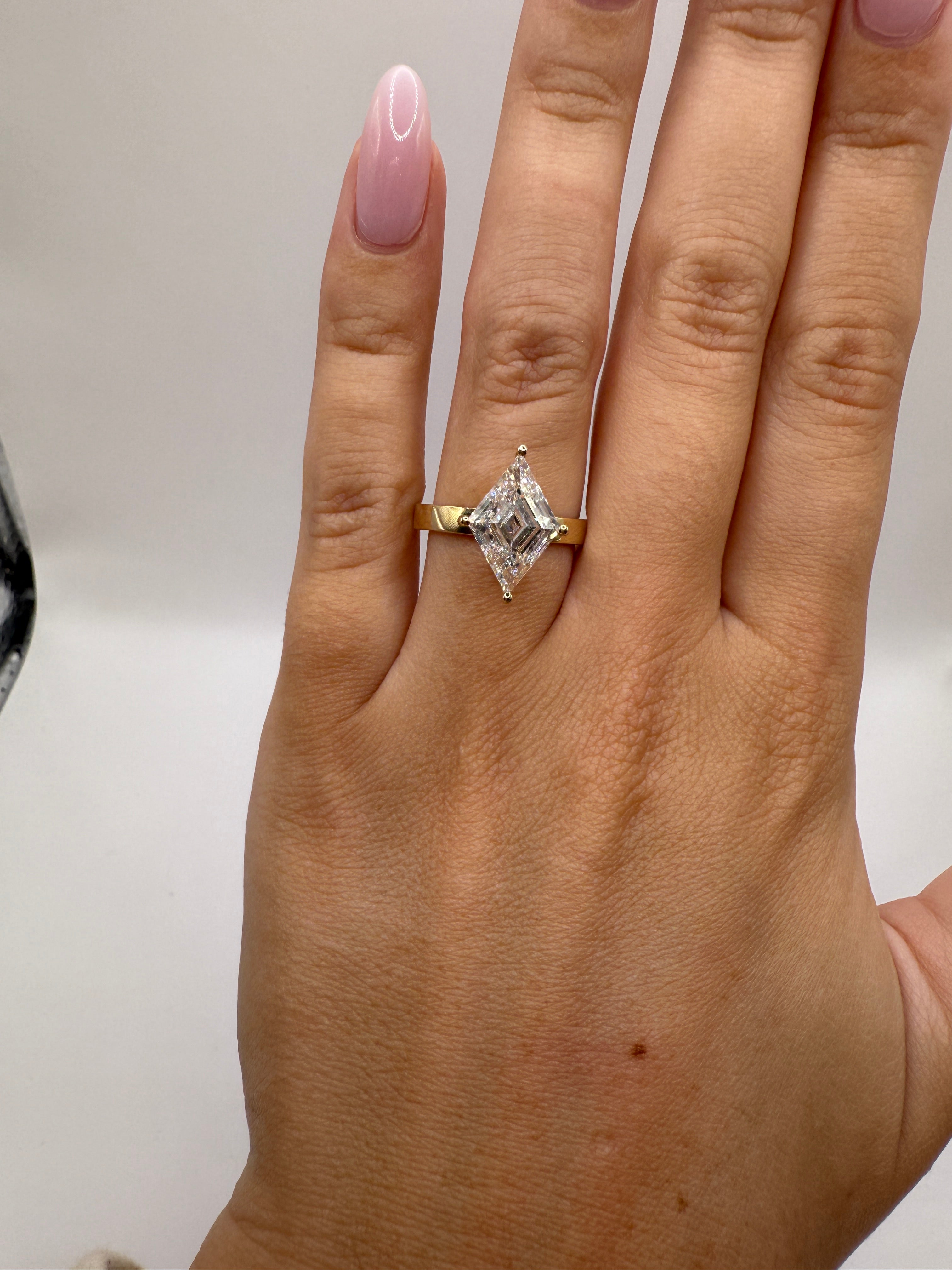 This gorgeous solitaire features a 3.02ct E/VVS2 Lozenge cut lab grown diamond on a 2.5mm 14k yellow gold flat band, size 6. One of my most requested specialty cut diamonds!