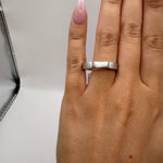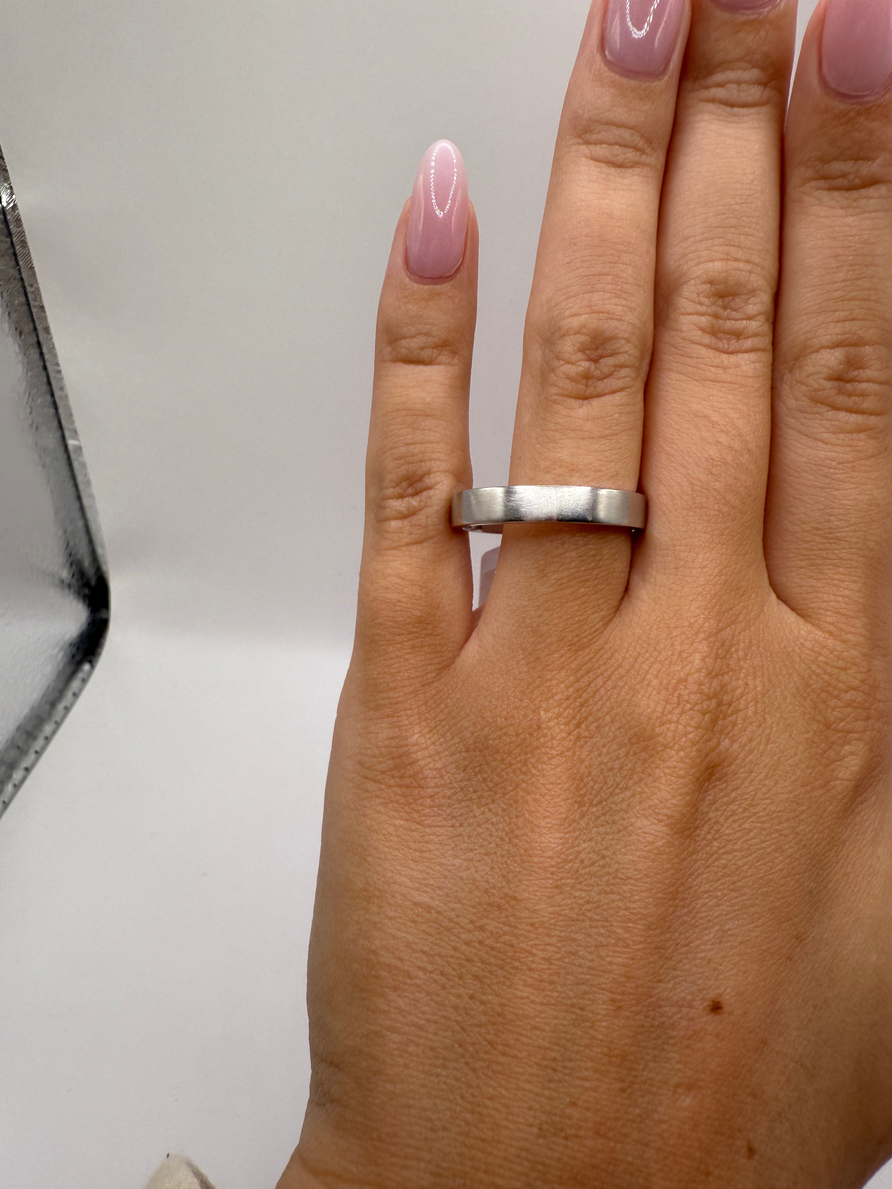This wedding band is a 4mm brushed 14k white gold wedding band, size 10.